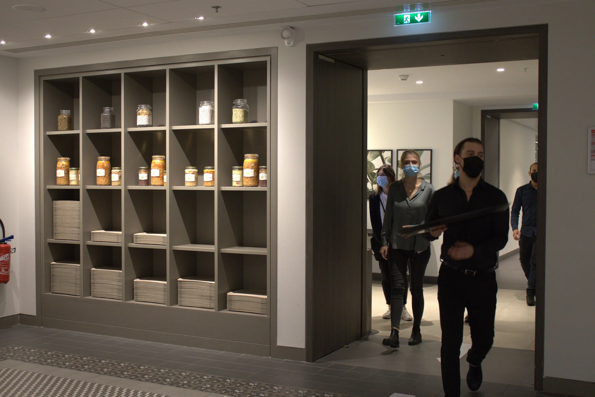 This is a simple vintage-style interior carved out of the restricted underground areas of the building. The previous canteen had featured a number of kitchens spaced around the perimeter of the dining zone, some obviously closed and others creating bottlenecks and queues. By reworking the plan to provide all serveries within a market hall we successfully consolidated kitchen space and simplified the circulation system. This practical solution also enabled a visual and olfactory feast - a gastronomic experience with fresh surprises each day. We used white metro tiles, painted cabinets, quartz surfaces, oak panelling and blue feature tiles as a practical backdrop to the stunning display of food.